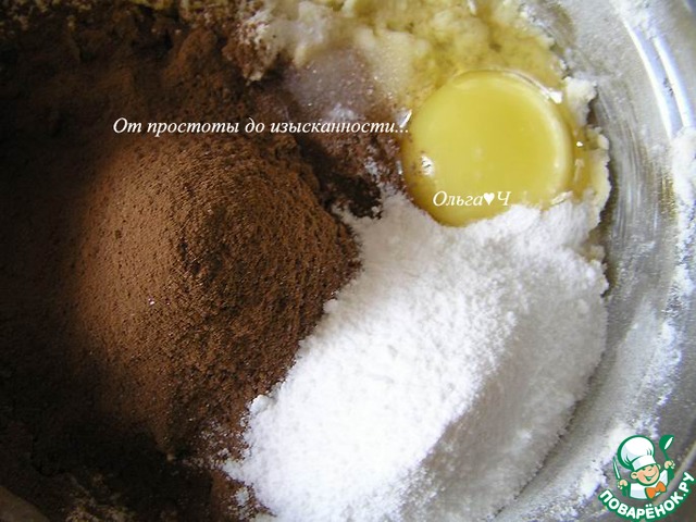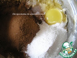 Добавьте какао, разрыхлитель, сахарную пудру, яйцо, соль и ванилин (или корицу).