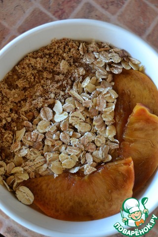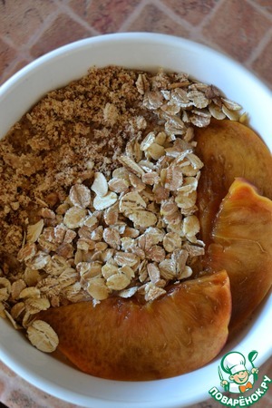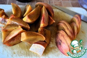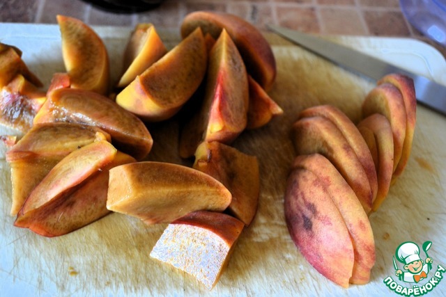 Персики нарезать. Одну половину одного персика оставить для украшения.