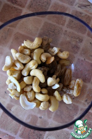 - Сухофрукты (любая смесь; у меня кешью и изюм) — 50 г