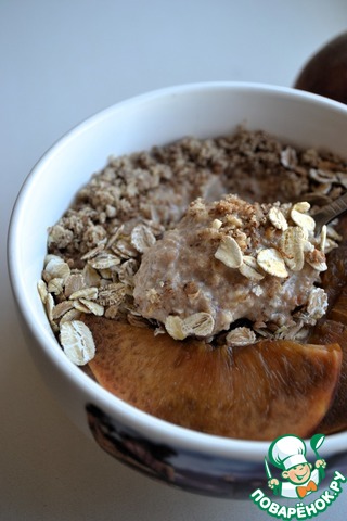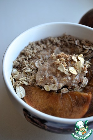 В широкую пиалу вылить кефирную смесь. Сверху выложить дольки персика, часть хлопьев и крошку миндаля. -