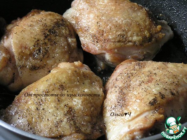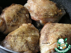 Куриные бедра посолите, поперчите, обжарьте на растительном масле до румяности, выложите в глубокую тарелку, держите в тепле.