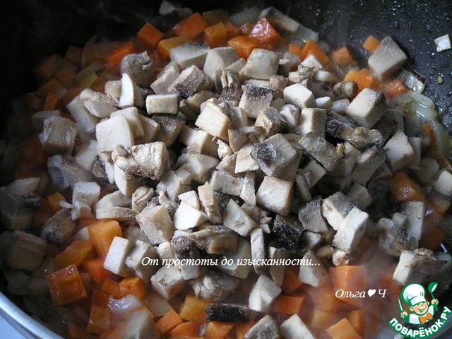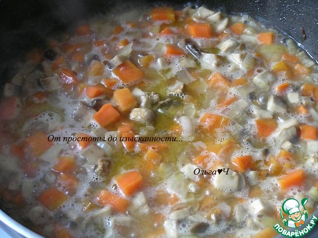 Добавьте мелко нарезанные грибы, готовьте пока не испарится лишняя жидкость.