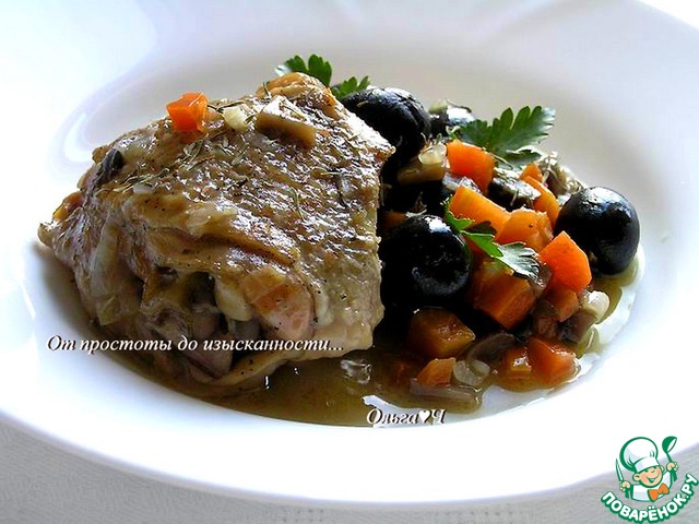 Ароматная курочка во французском стиле с овощами, грибами и маслинами, томленная в белом вине. Попробуйте!
