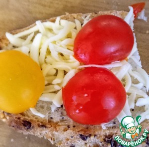 На кусочки хлеба выложите сыр и нарезанный помидор.