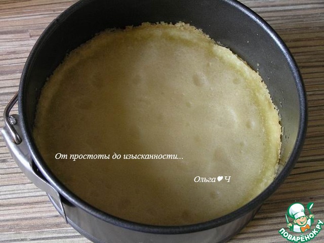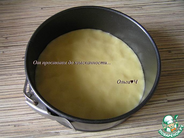 Тесто распределите руками в форме (лучше возьмите квадратную 20х20 см или диаметром 18-20 см).