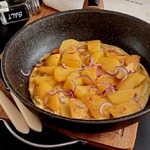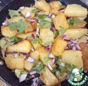 К блюду добавить отложенный картофель. Посыпать четвертью лука и оставшейся кинзой. Спрыснуть лимонным соком и 1 столовой ложкой оливкового масла. Можно подавать. Приятного аппетита!