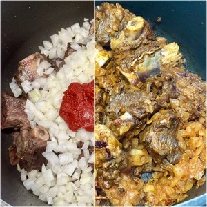 А потом выложил в котел почти восемьсот граммов, все-таки, говяжьих ребер. И, постоянно перемешивая, их слегка обжарил. Минут десять на сильном огне. Но! Постоянно вороша.