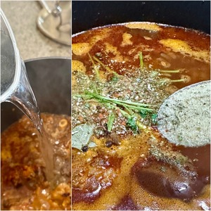 Дальше залил получившееся в котле мясо с прочим, кипятком (примерно литра два с половиной) и оставил томиться на маленьком нагреве примерно один час. Через час добавил зеленый букет, смесь кореньев, лавровый лис, перцы горошком, соль.