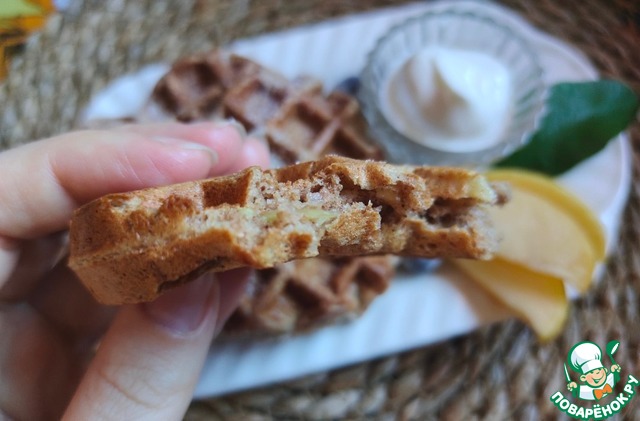 Вот такие вафли получились. Корочка снаружи и мягкий ароматный мякиш с кусочками яблока внутри.