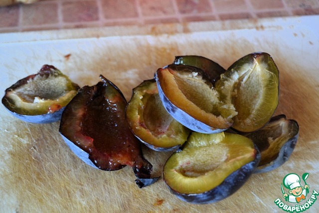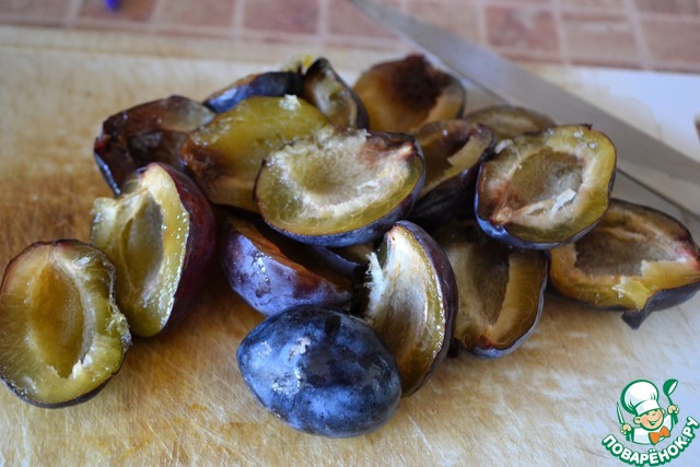 Оставшиеся свежие сливы также разрезать пополам, косточку удалить.