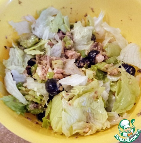 Добавить салатные листья. Осторожно перемешать. Можно подавать. Приятного аппетита.