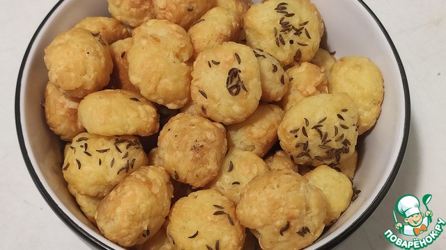 Это просто супер-мега классная идея. Вот насколько я не люблю готовить заварное тесто, но тут вообще не возникло проблем. Правда, само тесто получилось густоватым, и даже если бы у меня был кондитерский мешок, я бы не смогла его использовать. Зато маленькие шарики скатались просто на ура, получились крошечные сырные печенюшки. Хрустящие и вообще прекрасные во всех отношениях.