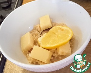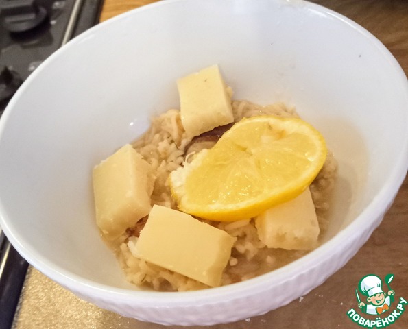 Убрать рис с плиты. Спрыснуть лимонным соком и посыпать сыром манчего. Подавать с кусочками сыра манчего. Приятного аппетита!