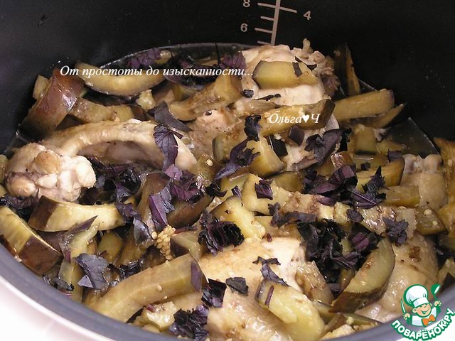 Ароматная курочка с баклажанами и свежим базиликом, томленная в мультиварке. Способ приготовления не принципиален, можно воспользоваться и обычной сковородой. Попробуйте!