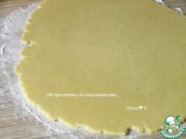 Тесто раскатайте между двумя листами пищевой пленки. Я посыпала рабочую поверхность мукой, а сверху стелила бумагу для выпечки.
