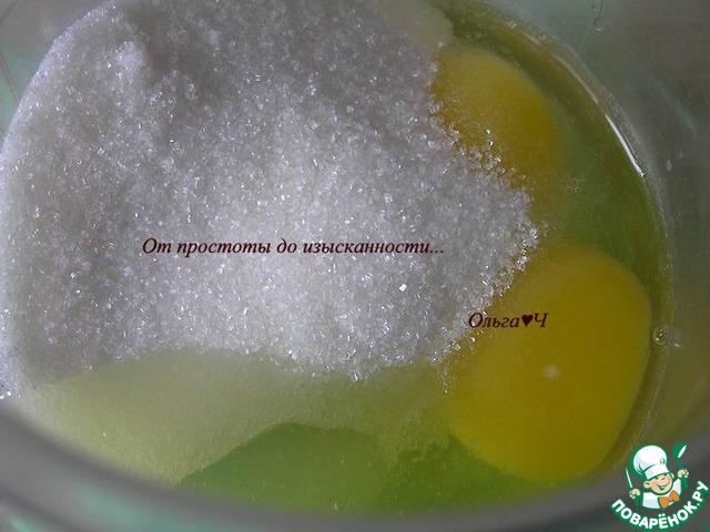 Для начинки соедините яйца с сахаром в чаше для миксера. Взбейте около 10 минут.