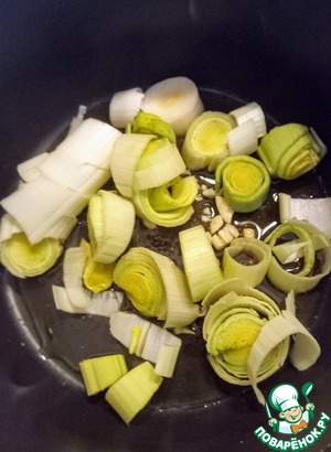 масло, лук-порей, перец красный жгучий и чеснок. Готовить на сильном огне 4 минуты.. -