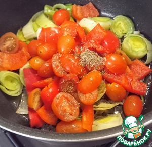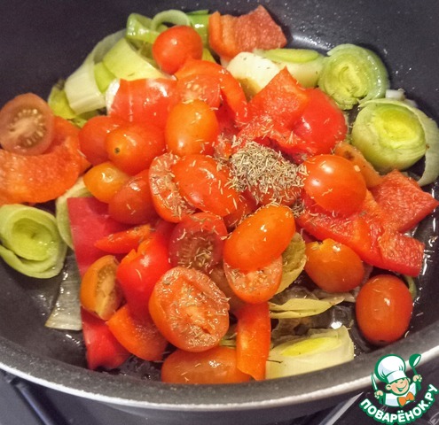 Уменьшить огонь до среднего. Добавить тимьян, перцы и помидоры и варить 5 минут.