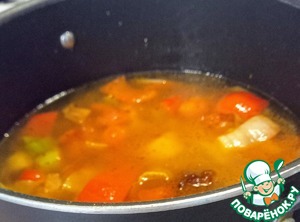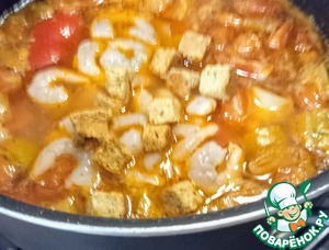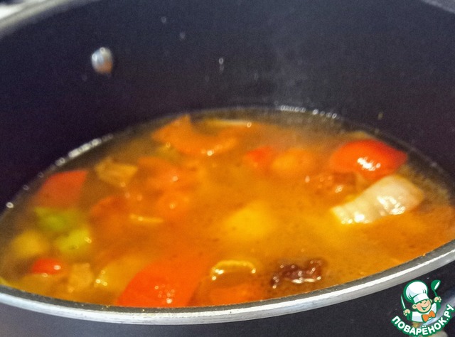 Затем добавить вино и томатную пасту. Варить минуты 2 до испарения вина. Добавить апельсиновый джем, 1 чайную ложку копчёной паприки, соль и 800 мл воды. Довести до кипения, уменьшить огонь и тушить 10 минут.
