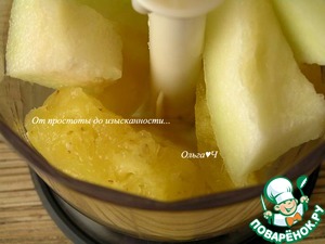 Ананас и дыню нарежьте кусочками, поместите в чашу блендера, влейте немного лимонада.