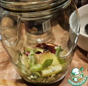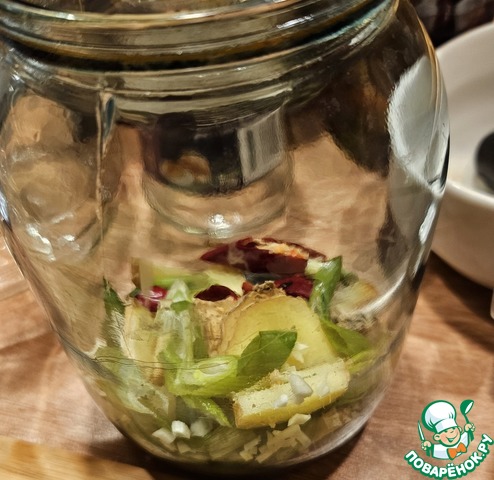 Овощи измельчить, чеснок нарезать поместить в банку, где будут мариновать яйца.