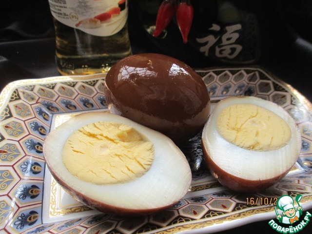 [+5]Маринада сделала полпорции, яйца мариновались 22 часа. Пряные, сладко солёные, остренькие. Внутри остались такого же цвета, но они солёные внутри! Я не кореец и мне, лично, хватило верхнего пропитанного специями слоя для вкуса.