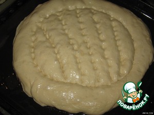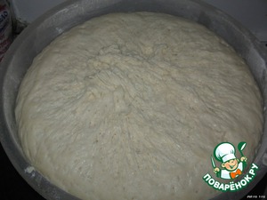 Через 20 минут тесто немного поднялось, наливаем на противень растительное масло, смачиваем руки в нём, берём тесто и, вываляв его в масле, формируем колобок, подминая тесто вниз.