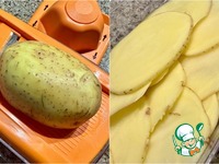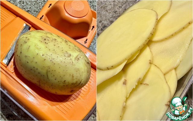 Значит, первым делом взял я крупную картофелину и её Слайсировал. Вот так! Не ножиком вульгарно – тонко нарезал, а именно на слайсере - слайсировал!