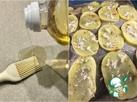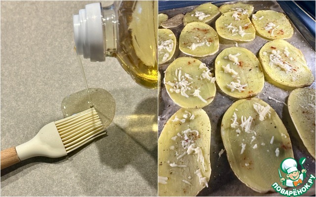 Застелил противень пергаментом и слегка смазал его растительным маслом. По слайсам, выложив их на пергамент, тоже кисточкой сверху маслом прошелся. Слегка так. Почти намёком, по художественному выражаясь, обозначил маслица.