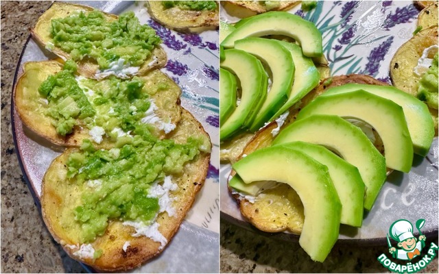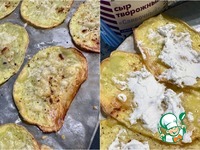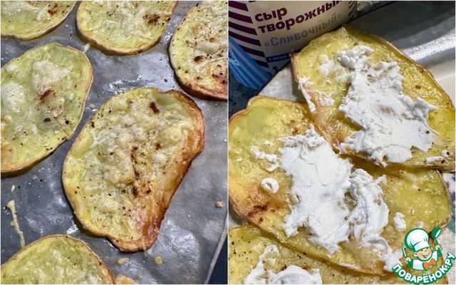 Во-первых, на картошку выложить немного творожного сыра и слегка его размазать.