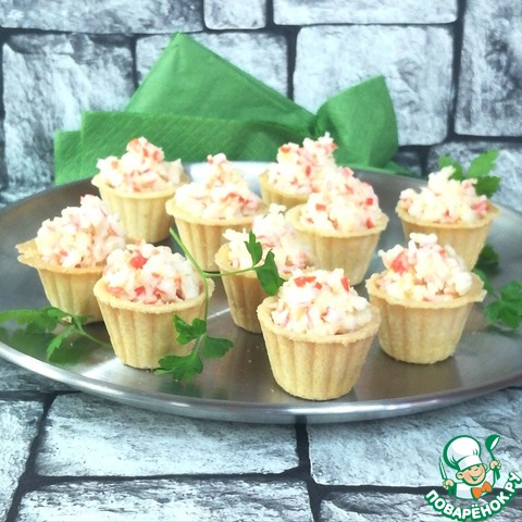 Лёгкая закуска-салат идеально подойдёт для фуршетного стола. Наполните тарталетки, волованы или профитроли этой простой, но вкусной и пикантной начинкой, и ваши гости точно не останутся равнодушными. Угощайтесь!