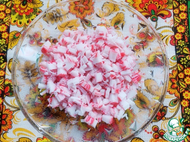Нарезать небольшими кусочками крабовые палочки.