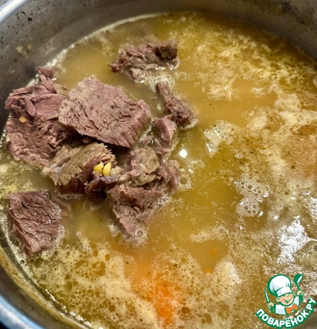 И отправляю его к мясу, в бульон. Да, да … не замачиваю я горох. А то, что он варится вместе с мясом: во-первых, избавляет суп от «артиллерийской» составляющей; во-вторых, мне нравится, когда горох в супе разваривается практически «насовсем»; в-третьих, совместная варка гороха и мяса объединяет вкусы этих продуктов и получается именно то самое «гороховое» удовольствие от супа.
