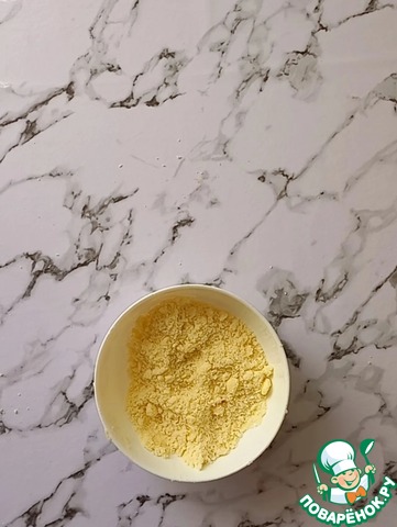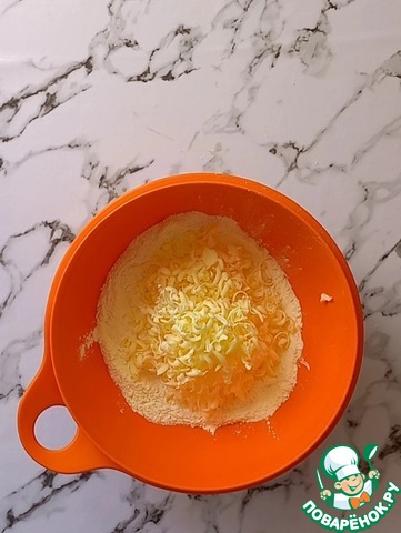 В муку проводим через терку сливочное масло. Перетираем в крошку.