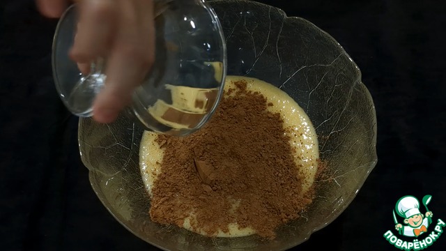 Получившиеся тесто разделите на две части. В одну из них добавьте 3 столовые ложки какао и хорошо перемешайте. (Если тёмное тесто получается слишком жидким добавьте немного муки)