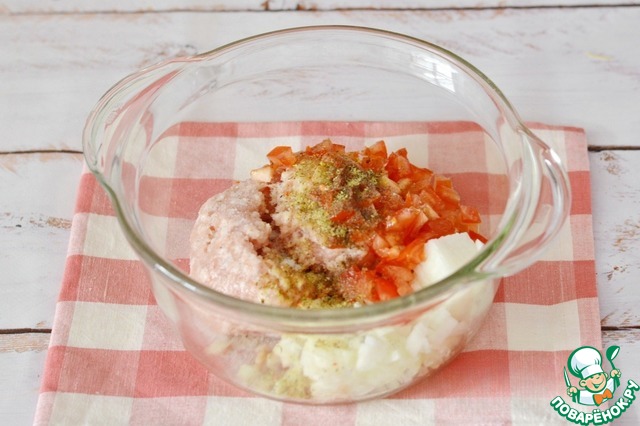 Нарежьте мелко лук и помидор, добавьте их к куриному фаршу. Приправьте по вкусу солью, перцем и специями для птицы. Всё смешайте.