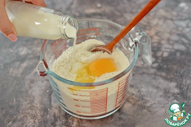 В миску для замеса просейте муку и смешайте её с солью и сахаром. Влейте в муку растворённые в воде дрожжи, вбейте яйцо и добавьте сливки.