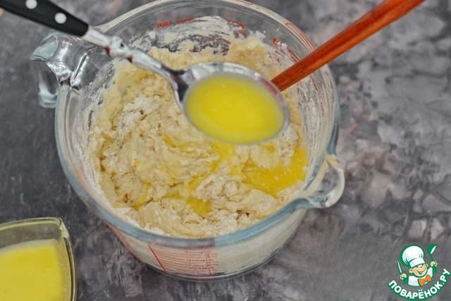 Начните замешивать тесто в рабочей ёмкости при помощи лопаточки. Растопите сливочное масло и в процессе замеса добавьте его в тесто.