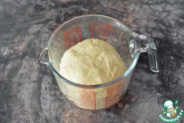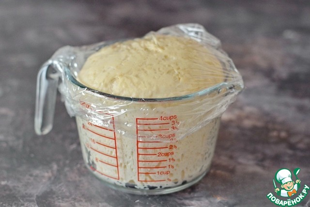 Готовое тесто верните обратно в миску, затяните её плёнкой и оставьте для подъема при комнатной температуре на 4-6 часов.