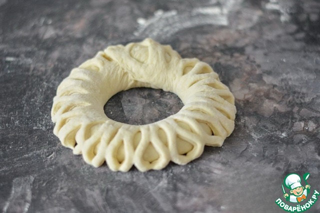 Затем соедините края рулета в кольцо и скрепите их. Тесто, разрезанное роликом, раскроется и получится красивый рисунок. Слегка расправьте его руками, чтобы рисунок был аккуратным.