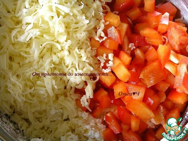 Добавьте нарезанный перец и половину тертого сыра, перемешайте.