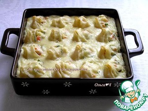 Пасту нафаршируйте получившейся начинкой, выкладывая в форму для запекания, смазанную маслом.