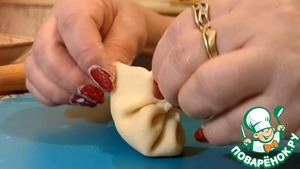 Сформируйте хинкали (детально показано в видео), складывая тесто в складки и закрепляя сверху.
