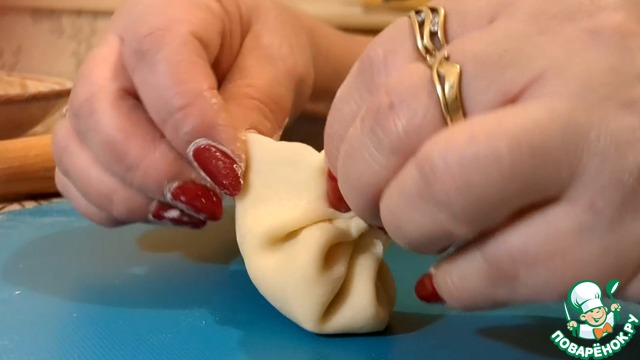 Диаметр кружочков теста у меня был примерно как кофейное блюдце, начинки клала добрую чайную ложку с горкой. И как бы я ни старалась, но складочек у меня выходило 12 штук. И влево лепила, и вправо – 12 складочек и ни одной больше. Эх… Правда сказать, когда положила меньше начинки, то складочек вышло 15.