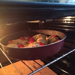 Форму с рыбой поставить на 25-30мин в духовку, заранее разогретую до 190С, затем вынуть, выложить помидоры черри, разрезанные пополам и поставить в духовку ещё на 10мин.