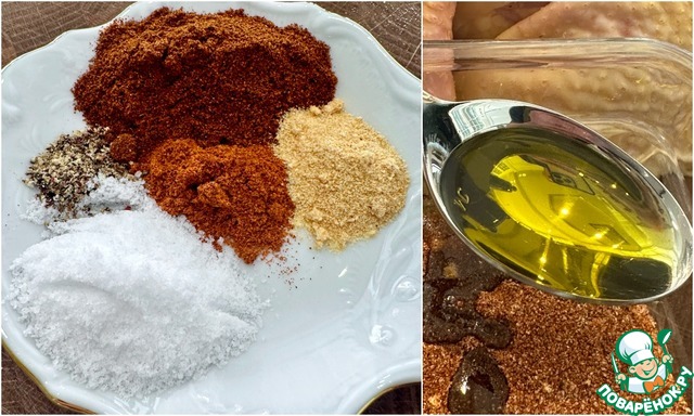 Пару чайных ложек паприки сладкой. Одну «с горкой» - паприки копчёной. Такую же дозу сухого чеснока, пол-ложки перца черного и соли две ложки. Хорошо их перемешал.