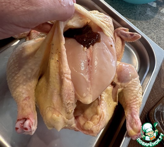 Кожа у курицы плотная, поэтому обязательно надо специи под кожу загнать. Отделяется она от тушки легко, трудностей не возникло. И размазать их хорошо, втереть в мясо. Остальное снаружи по коже тоже растереть тщательно. Немного тушку помассировать, чтобы все хорошо соединилось, притерлось
