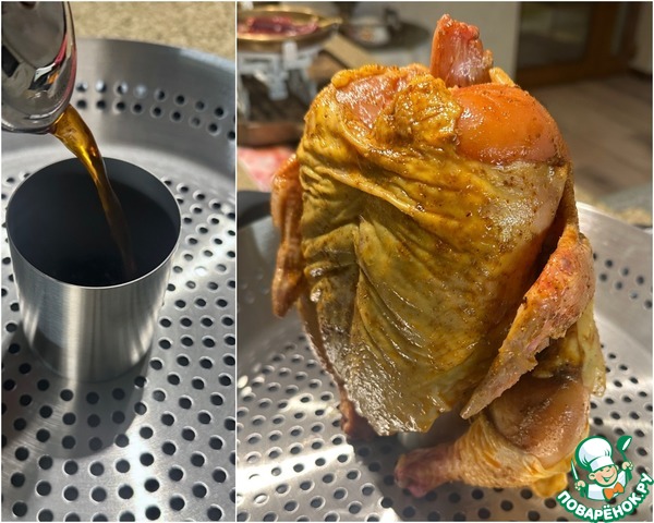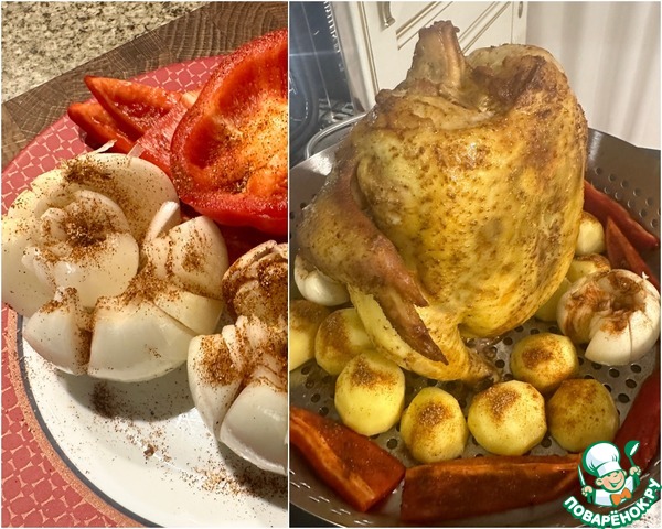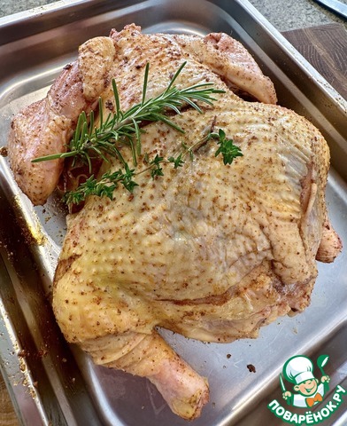 А вот такая картина образовалась без малого через полтора часа. Жарил я курицу до 80 градусов внутри тушки.