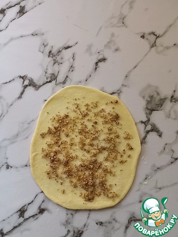 Раскатываем шарик теста. Смазываем мягким сливочным маслом. Посыпаем сахаром и измельченными грецкими орехами.