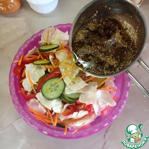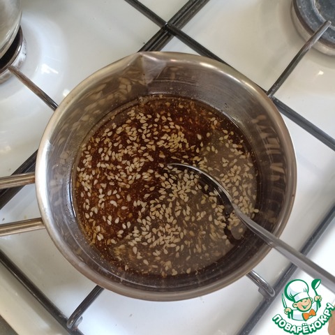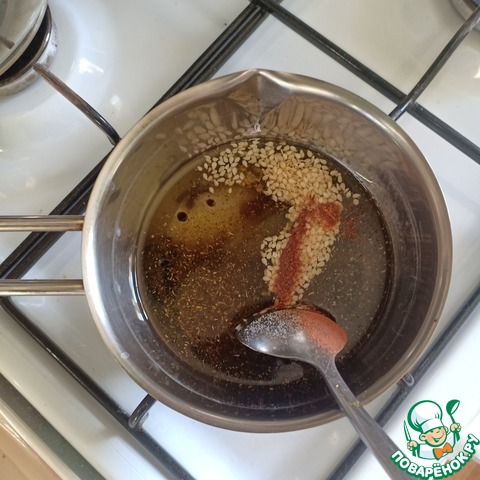 Для заправки смешать в сотейнике растительное масло, соль, сахар, специи, влить уксус и добавить кунжут.